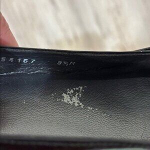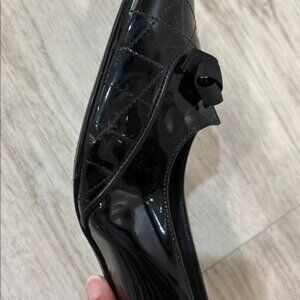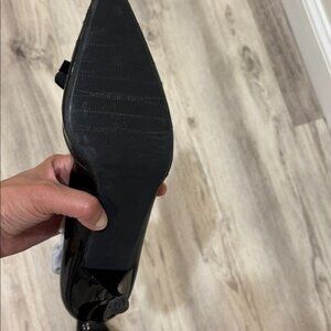 Stuart Weitzman black patent leather 9.5 point toe shoes in good condition, one shoe is dented , pictured, however when you put the shoe on, its not noticeable.
