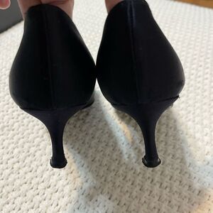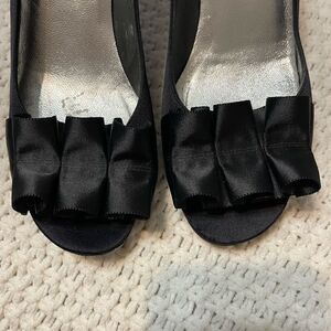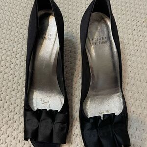 Stuart Weitzman black satin pleated open toe pumps heels, size 7 1/2