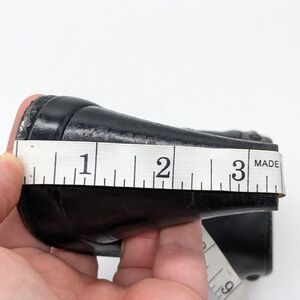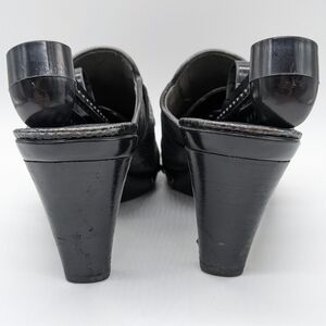 Stuart Weitzman black snakeskin pattern mule slip on heel 9.5. Wear on the heels, one heel needs the cover fixed, wear on the inside (see photos). Color is a shiny black.