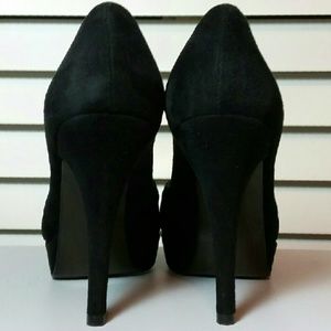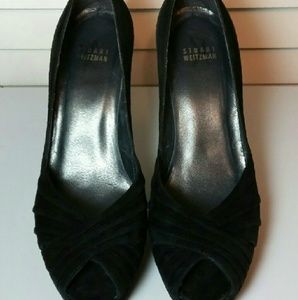 Stuart Weitzman black suede heels size 7.5. Suede upper, leather lining, leather sole. 4 inch heel with a 1 inch platform. Great condition. These could possibly also fit an 8.
