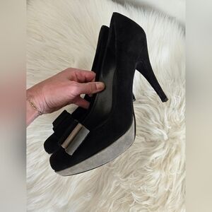 Stuart Weitzman black suede platform heals with bows, 4.5 inch heel, size 9