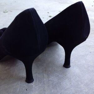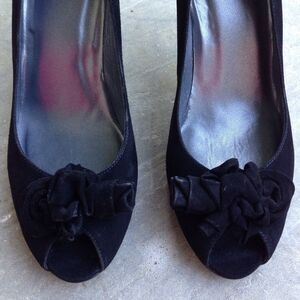 Black suede with rosette flower detail. Peep toe pump style with 3" heel. A little bit of wear to some edges of the rosette so that it is smooth leather.