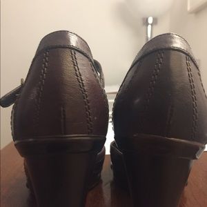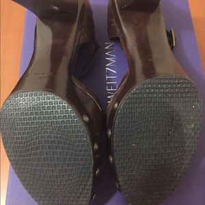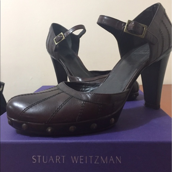 Deep brown leather ankle strap heels by Stuart Weitzman. Fantastic stiching detail in front and ankle. Brass rivets in platform are perfect addition. Incredibly comfortable. Walk all day. Heel 3.5" platform .75" Vsry well cared for.