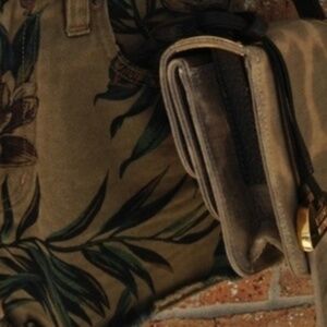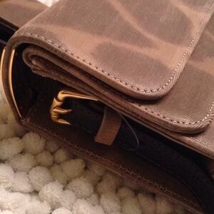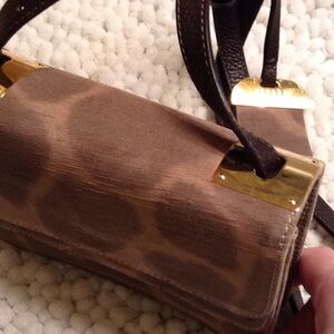 Tan and light brown giraffe print fabric with brown leather strap, gold hardware. Two front flaps. Strap has buckle on one side.