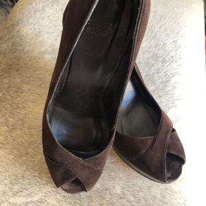 Stuart Weitzman dark brown suede peep toe platform heel embossed detail size 8.5