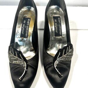 Stuart Weitzman for MR SEYMORE Black Satin Pumps Rhinestone Feather Accent Sz 7