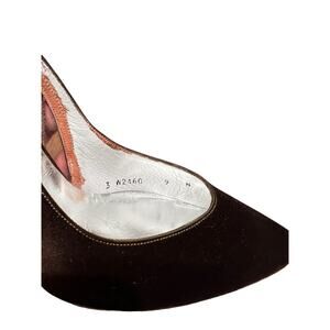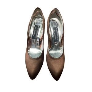Great condition vintage designer brown satin heels. Gorgeous embellishments. Leather sole, made in Spain.