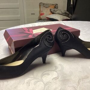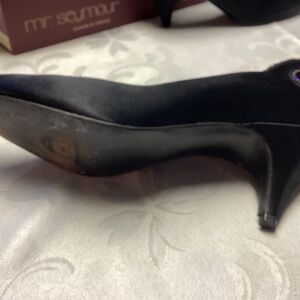 Questions? Leave a comment below! these are beautiful you can see they still have the nice pads in there to keep your foot from slipping. They’re all satin there ordained or decorated rather with a beautiful squirrel of rhinestones. The heel is 2 inches. These are narrow. I do have another pair of beautiful red narrow shoes from the same lady and you might wanna look at those as well. They’re beautiful very gently loved lots of love left lots of wearability. These are gorgeous. We know Mr. Seymour shoes are very high-quality. These are a vintage item PLEASE NOTE SIZE SAYS 8 N ON BOX. Thers no size like that just an 8 BUT THESE ARE A NARROW