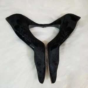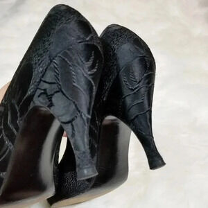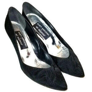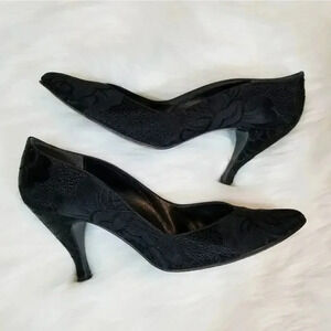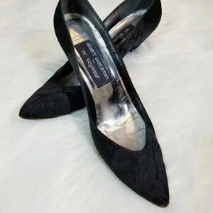 TRUE VINTAGE: Adorable vintage heels by Stuart Weitzman for Mr. Seymour. Black embroidered. About 2" heel. Silver inside sole.