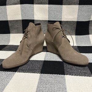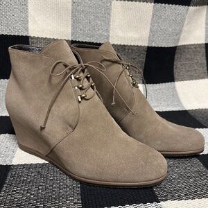 Stuart Weitzman like new comfort wedge lace up taupe tan suede leather booties