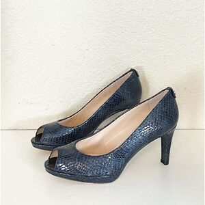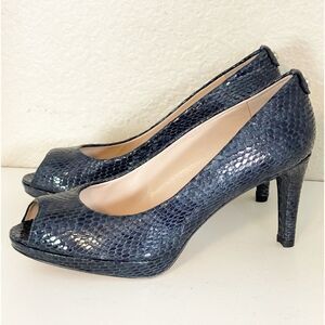 Chic and edgy platform peep-toe heels with a snakeskin pattern. Perfect for any occasion. A few surface scuffs on sole and look like new. Actually comfortable!