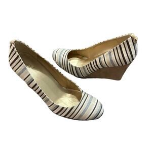 Stuart Weitzman wedge heel, neutral cream, tan, gray and brown stripes, tan suede leather wrapped wedge, round toe, slightly cushioned leather insole, leather sole