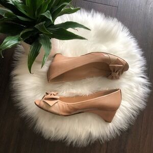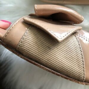 Patent leather peep toe pumps with a fabric panel new the bow. 2 inch heel. General wear with some marks. Please review photos for wear