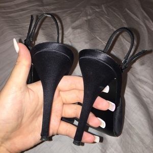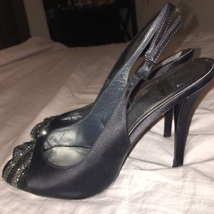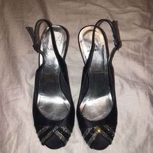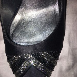 These evening peep toe sling backs are embellished with silver and black crystals on the toe. The shoe is wrapped in flawless black satin. They are simple enough to go with any formal look.✨✨ EUC- size 9.5 but fits like a true 9- very narrow. Style FW13038