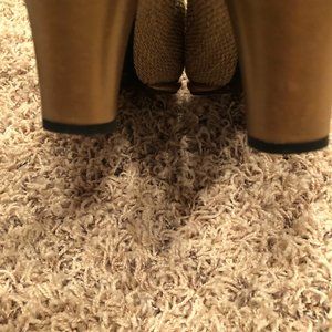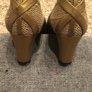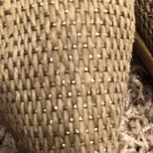 Fabulous, classy pumps that are so comfortable. Beautifully made shoe. Pics shows there is a little wear on the leather bottom but none on the heel. The metallic strands weave through the fabric and make the shoes shimmer. Really an elegant shoe.