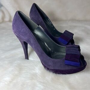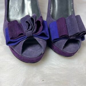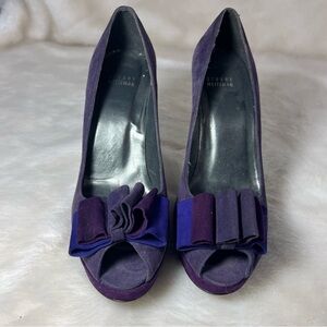 Stuart Weitzman purple peep toe bow heels platform retro sz 9 suede pumps shoes