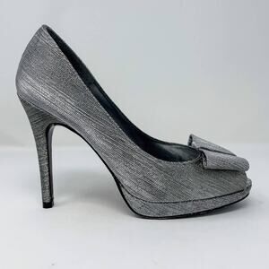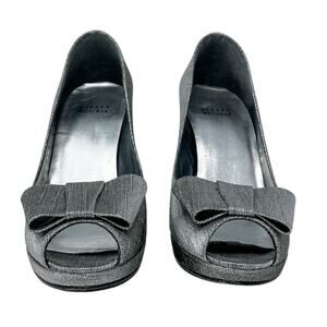 Stuart Weitzman silver pewter Bowright peep toe bow platform pumps size 8