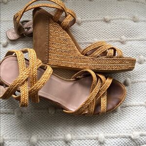 The BEST sexy summer wedge sandal in straw colored woven raffia with suede detailing. Versatile, comfortable, and in great shape!