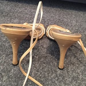 Beige and cream strappy sandals. Tie up the calf. About 2 1/2 heels. Scraps on back of heels.