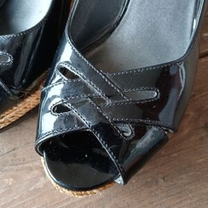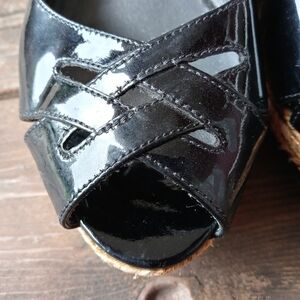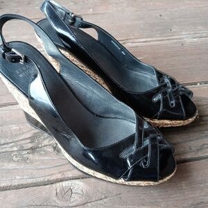 Stuart Weitzman women's black patent leather platform espadrille slingback wedge heel sandal. Sz 8M. 145.1pm