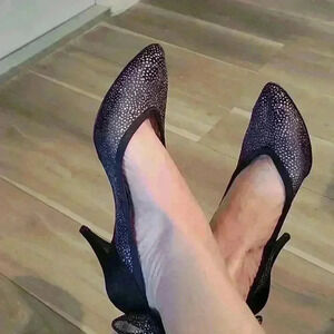 very pretty shoes with netting and glitter detail. used. I shipped to another seller and the right heel cap broke in shipping. I have added black heel caps to relive the issue. see pics.