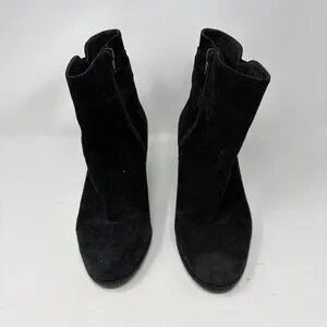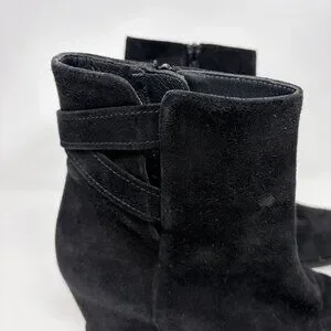 Stuart Weitzman women's Fitness hidden wedge booties, size 8.5M. Black suede uppers. Crossover cut-out detail at ankles. Inside zip for easy on/off. Gently worn, in good used condition.