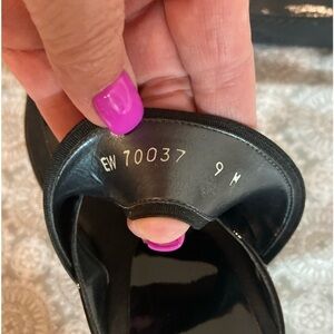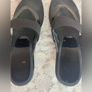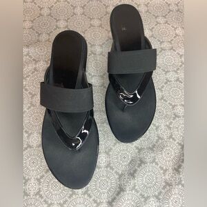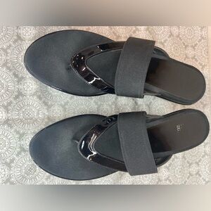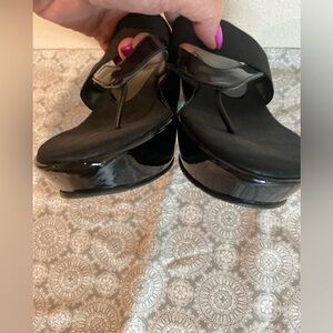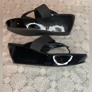 Stuart Weitzman~Black Patent Leather Thong Wedge Sandal~Matte Over Strap~Size 9