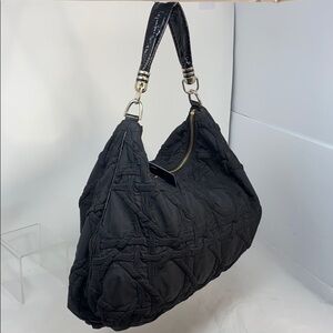 This is a wonderful Stuart Weitzman Large Black Quilted Fabric & Patent Leather Hobo Shoulder Bag