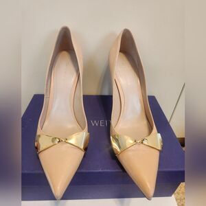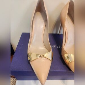 Stuart Weitzman Cream Nappa Leather Stiletto Pumps w/Gold Metal Bow Sz.8 $425