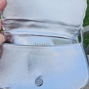 Add a touch of elegance to any outfit with this stunning Stuart Weitzman metallic embroidered shoulder bag. The bag features intricate floral embroidery in soft silver tones, accented by a delicate scalloped edge and metallic silver trim. The durable strap ensures comfort while the classic design gives it timeless appeal. The interior includes a functional zippered pocket and a U.S. patent-pending magnetic snap closure. Despite some minor signs of wear on the back of the bag (visible in the photos), this purse is in overall excellent condition and ready for your next stylish outing.