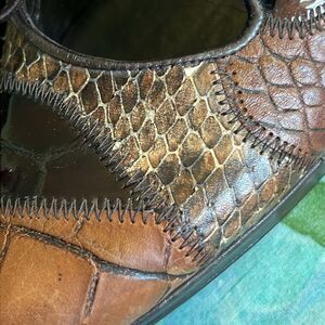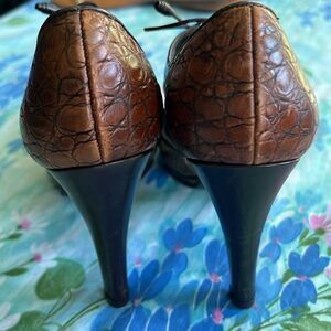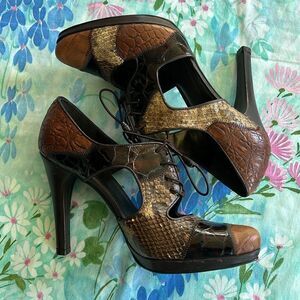 Not 100% sure of the size but a photo is posted of it. 3.5” heels in mixed leather textures. The snakeskin is lifting just a very little, it’s pretty uniform so it looks ok. Very little signs of wear mostly to the leather part of the heel, pictures were taken of the spots. Soles are rubbery so possibly skid resistant. Gorgeous shoes.