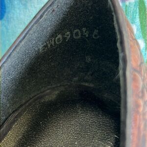 Not 100% sure of the size but a photo is posted of it. 3.5” heels in mixed leather textures. The snakeskin is lifting just a very little, it’s pretty uniform so it looks ok. Very little signs of wear mostly to the leather part of the heel, pictures were taken of the spots. Soles are rubbery so possibly skid resistant. Gorgeous shoes.