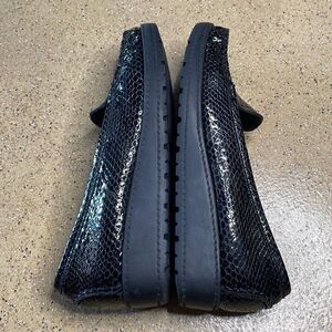 Additional Details: Nicely padded footbed liner, whipstitched toe boxes, rounded toes, snake embossed patent leather that has subtle gunmetal pearlized variations throughout, grippy rubber soles.