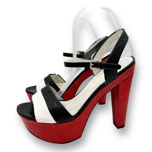 These Stuart Weitzman platform sandals are a chic and fashionable choice! The black, white, and red design with an ankle strap adds a trendy retro touch to any outfit, and the platform style provides extra height and comfort. They're perfect for dressing up or down and making a statement with your footwear! Retailed for $325.