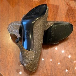 Elegant Stuart Weitzman pumps with 2 1/2 inch heels. Open toe. Decorative metallic bow in front. Silver gold metallic throughout (works beautifully with silver and gold clothing). Extremely comfortable. Excellent condition