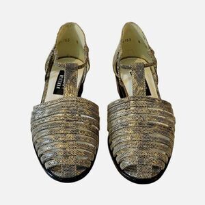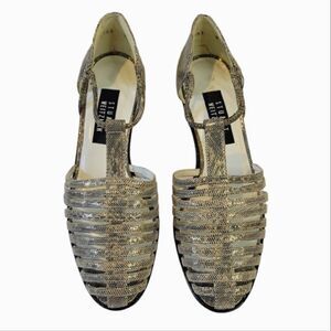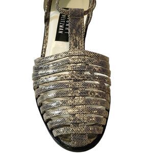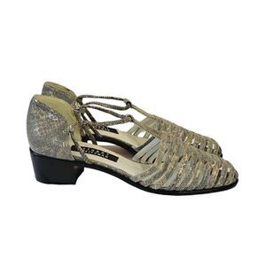Stuart Weizmann Gold Animal Print Leather Block Heel T-Strap Sandals Size 9.5