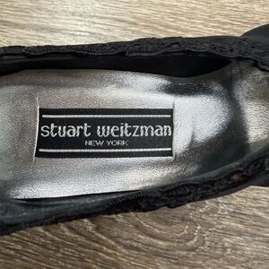 Add a touch of romantic sophistication to your wardrobe with these Stuart Weitzman Negligee Pumps. Designed with a sleek black leather sole and a delicate fabric lace upper, these heels offer an effortlessly elegant look for evening events, weddings, or any moment that calls for timeless style. The pointed toe and feminine heel create a flattering silhouette, while the lace detailing brings soft, feminine charm to this classic design.