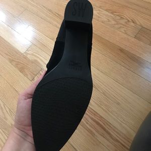 Black suede, super confortable 21/4 “ heel. Waterproof treated good for at least 2 months!!!!