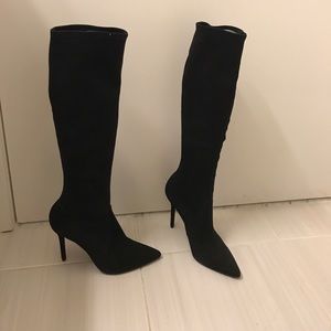 New with box.Pointed - toe up-to-the-knee boot in black suede. Pull on stretch. Heel = 4 inches.