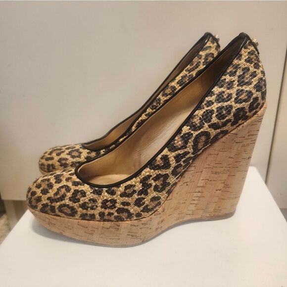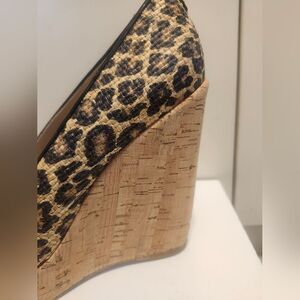 Stuart Weitzman Blk/Tan Leopard Print Raffia Platform Wedge Pumps