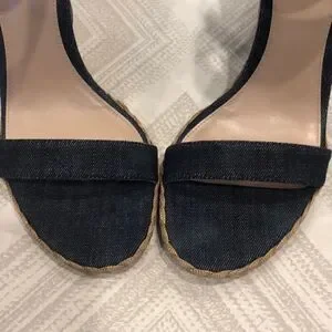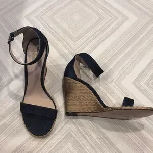 Authentic Stuart Weitzman dark blue denim wedge sandals, size 8.