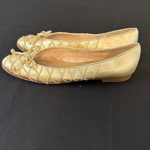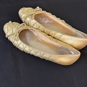 So pretty! Elegant gold quilted ballet flats with a chic bow detail. Perfect for adding a touch of glamour to any outfit. Great shoes in great condition!