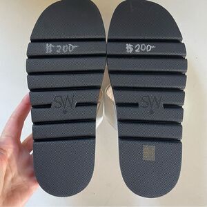 Stuart Weitzman White Leather Elodie Slide Platform Sandal. NEW without box. Comes with a dustbag. Beautiful, genuine leather. These fit like a 7.5 so listing as such. Purchased at a warehouse sale for $200. They don’t quite fit me. Enjoy!