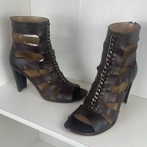 Additional Details: Brass tone chain link accents, stacked wooden heels, back zip entry.