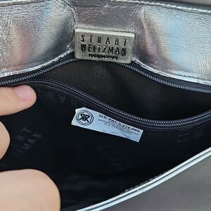 Keywords: Stuart Weitzman, embroidered bag, metallic shoulder bag, vintage purse, designer bag, silver handbag, floral embroidery, scalloped edge, luxury handbag, magnetic snap closure, pre-owned designer, elegant evening bag, evening purse, metallic bag, prom, formal