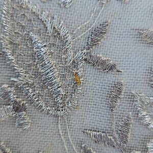 Add a touch of elegance to any outfit with this stunning Stuart Weitzman metallic embroidered shoulder bag. The bag features intricate floral embroidery in soft silver tones, accented by a delicate scalloped edge and metallic silver trim. The durable strap ensures comfort while the classic design gives it timeless appeal. The interior includes a functional zippered pocket and a U.S. patent-pending magnetic snap closure. Despite some minor signs of wear on the back of the bag (visible in the photos), this purse is in overall excellent condition and ready for your next stylish outing.