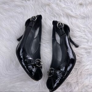Stuart Weitzman Chatup peep toe Slingback heels size 7.5M. Black patent leather with leather insoles and soles. Rubber heels and adjustable ankle straps. Peep toe front and cut out sides. Buckle accent on toe. Few marks on shoes, typical wear on soles.