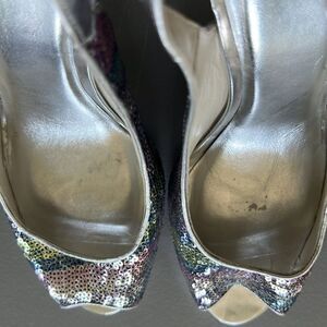 Great pre worn condition some wear on soles outer and left inner ball area missing a tiny bit of silver, right shoe has a tacky spot inner sole ball area from price tag. Otherwise great condition. Silver, sequined shoes in a pink, blue, silver, lime colorway. There are remnants of a tag on the bottom of one shoe.