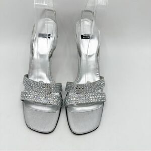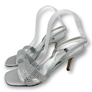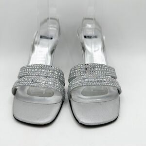 Stuart Weitzman Silver Leather Crystal Beaded Sling Back Heels Size 10 Narrow. Ready for formal events or parties, these stiletto sling backs feature a squared open toe and a satin wrapped heel. Dainty and light.