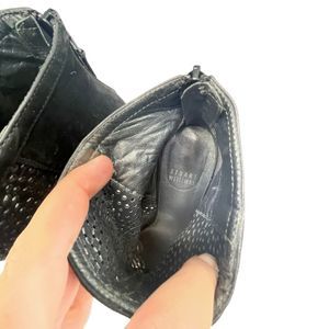 Stuart Weitzman black perforated open toe bootie. In and out heels.